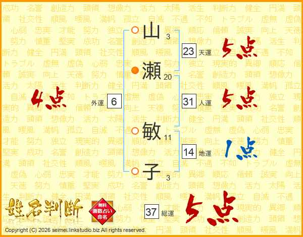 山(3画)瀬(20画) 敏(11画)子(3画)