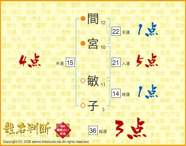 生活面を象徴する運勢です。外部から受ける影響力を表し、結婚運、家庭運や職場、環境への順応性を表します。総運から人運を引いた画数。姓や名が1文字の場合を除く。
