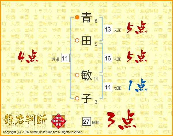 青(8画)田(5画) 敏(11画)子(3画)