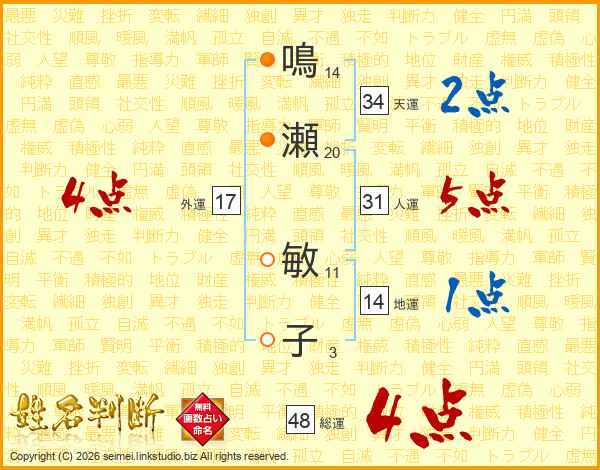 鳴(14画)瀬(20画) 敏(11画)子(3画)
