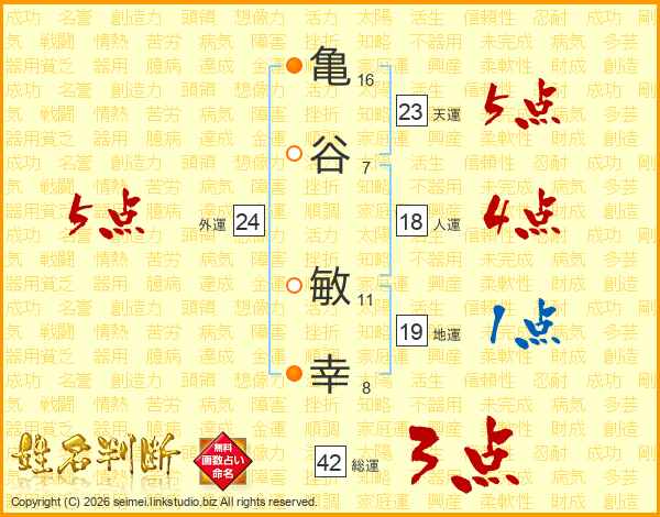 亀(16画)谷(7画) 敏(11画)幸(8画)