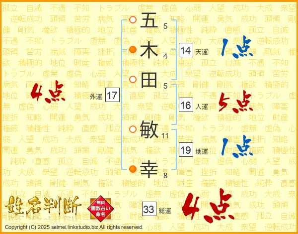 五(5画)木(4画)田(5画) 敏(11画)幸(8画)