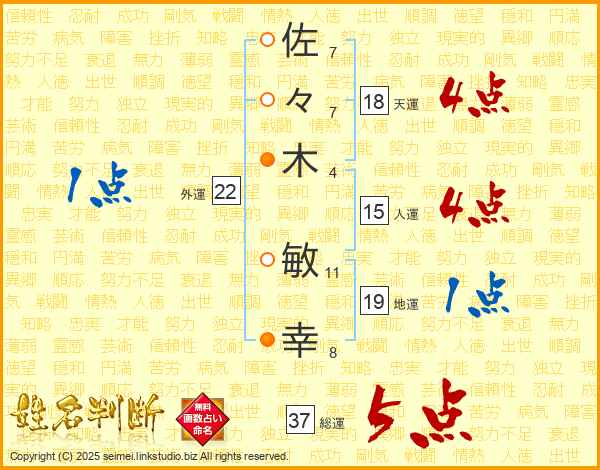 佐(7画)々(7画)木(4画) 敏(11画)幸(8画)