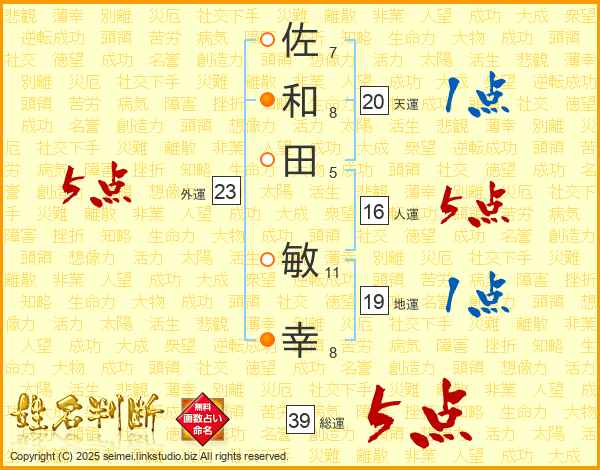佐(7画)和(8画)田(5画) 敏(11画)幸(8画)