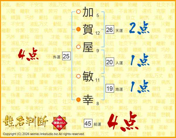加(5画)賀(12画)屋(9画) 敏(11画)幸(8画)