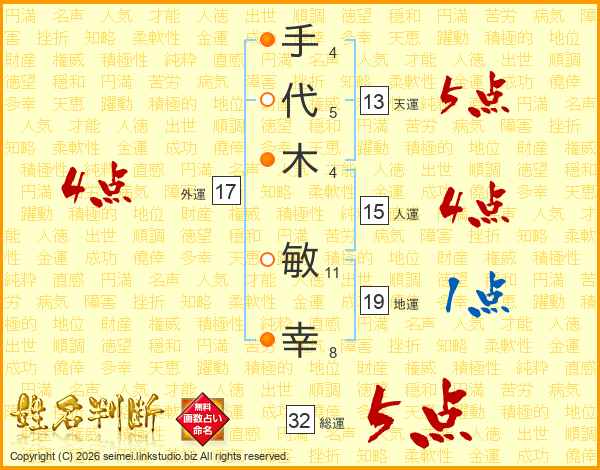 手(4画)代(5画)木(4画) 敏(11画)幸(8画)