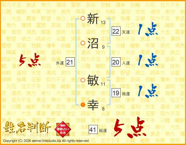 新沼敏幸さんの総運は41画の5点!