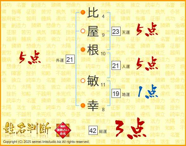 比(4画)屋(9画)根(10画) 敏(11画)幸(8画)