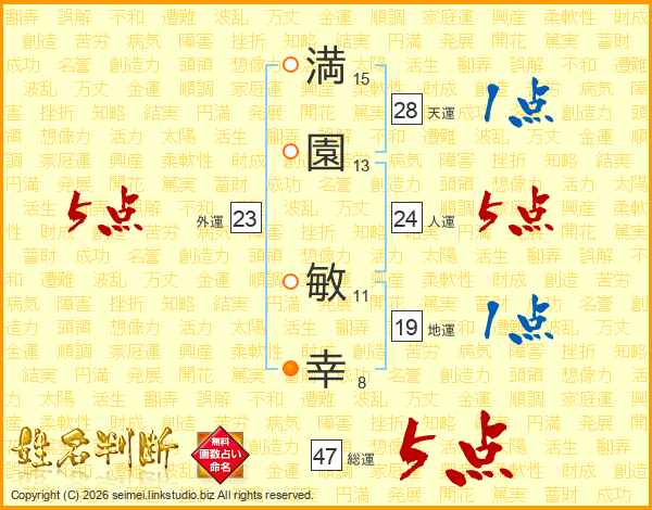 生活面を象徴する運勢です。外部から受ける影響力を表し、結婚運、家庭運や職場、環境への順応性を表します。総運から人運を引いた画数。姓や名が1文字の場合を除く。