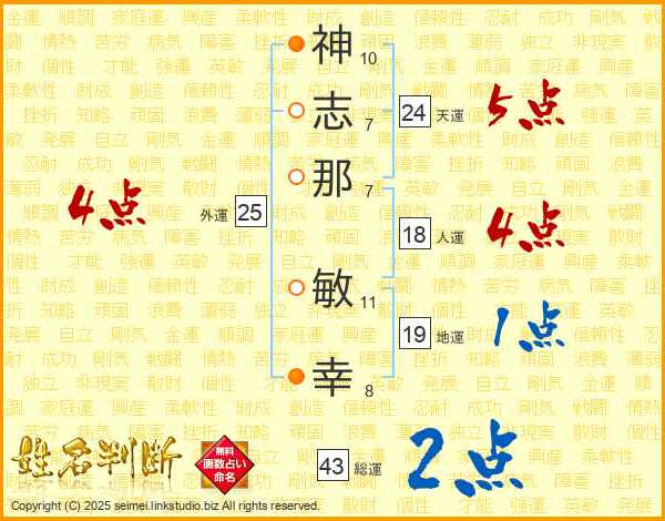 神(10画)志(7画)那(7画) 敏(11画)幸(8画)