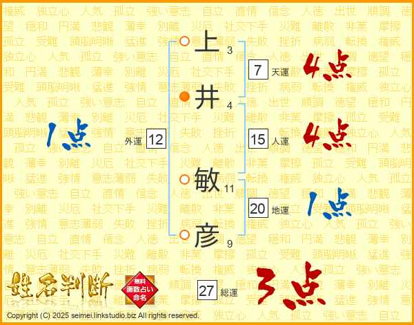 生活面を象徴する運勢です。外部から受ける影響力を表し、結婚運、家庭運や職場、環境への順応性を表します。総運から人運を引いた画数。姓や名が1文字の場合を除く。