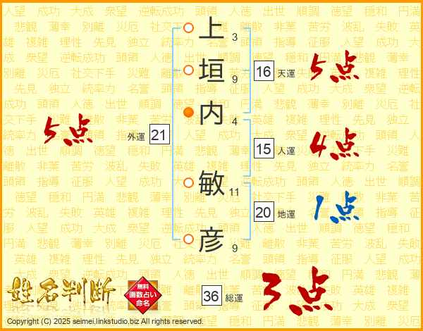 上垣内敏彦さんの総運は36画の3点!