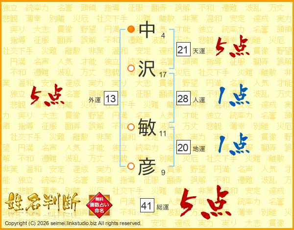 中沢敏彦さんの天運は21画の5点!
