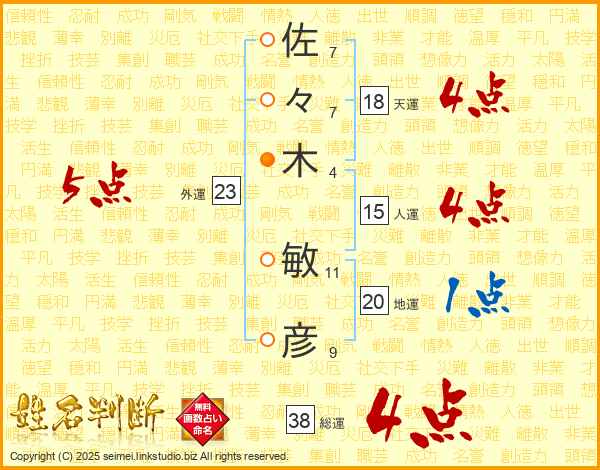 佐(7画)々(7画)木(4画) 敏(11画)彦(9画)