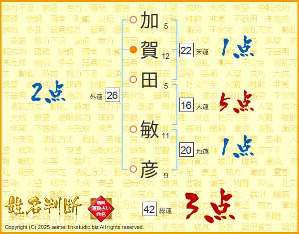 加(5画)賀(12画)田(5画) 敏(11画)彦(9画)