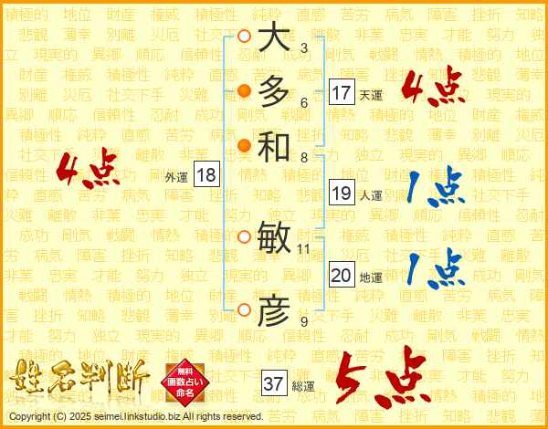 大(3画)多(6画)和(8画) 敏(11画)彦(9画)