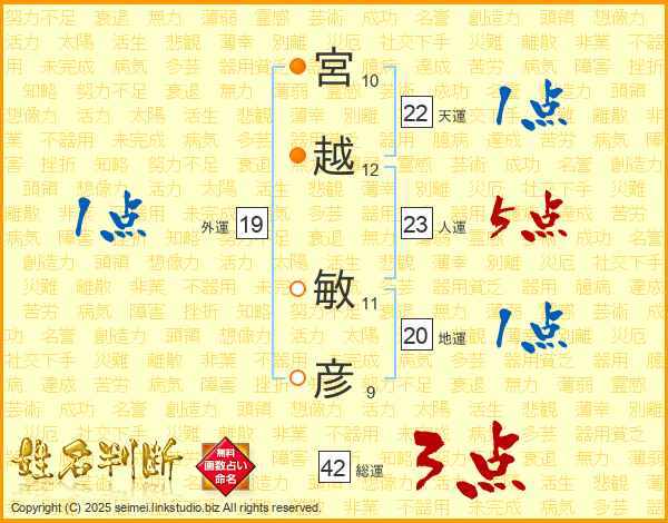 宮(10画)越(12画) 敏(11画)彦(9画)
