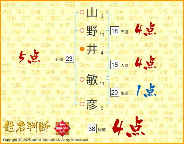 山(3画)野(11画)井(4画) 敏(11画)彦(9画)