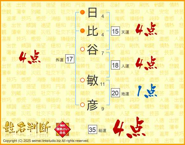 日(4画)比(4画)谷(7画) 敏(11画)彦(9画)