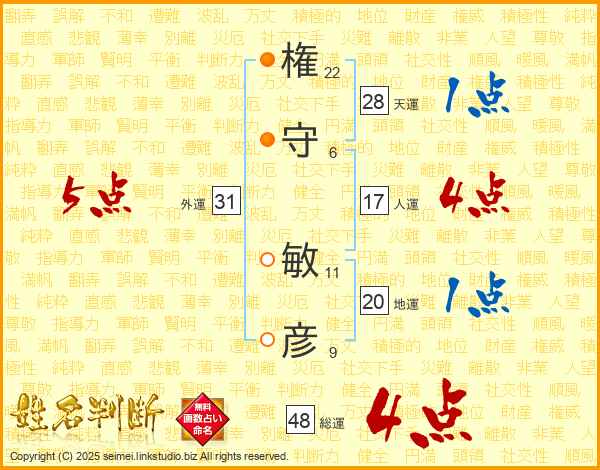 生活面を象徴する運勢です。外部から受ける影響力を表し、結婚運、家庭運や職場、環境への順応性を表します。総運から人運を引いた画数。姓や名が1文字の場合を除く。