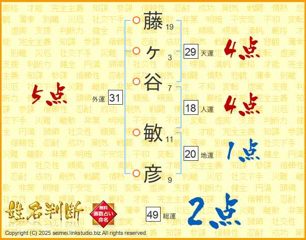 藤(19画)ヶ(3画)谷(7画) 敏(11画)彦(9画)
