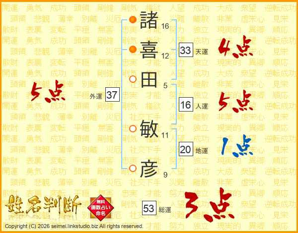 諸(16画)喜(12画)田(5画) 敏(11画)彦(9画)