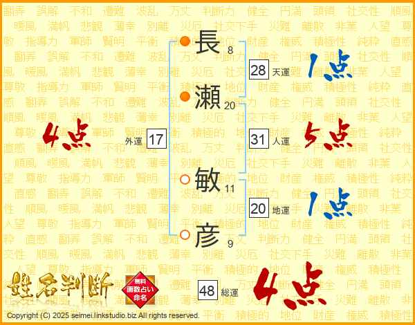 長(8画)瀬(20画) 敏(11画)彦(9画)