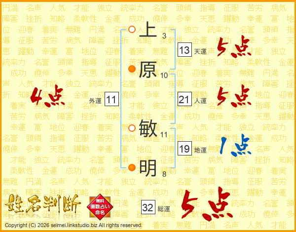 上原敏明さんの総運は32画の5点!