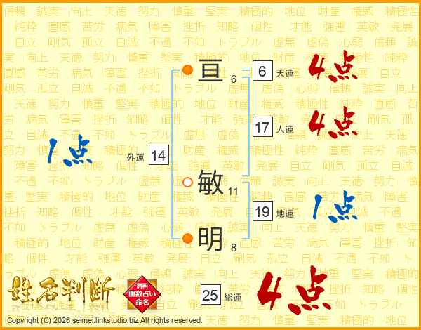 生活面を象徴する運勢です。外部から受ける影響力を表し、結婚運、家庭運や職場、環境への順応性を表します。総運から人運を引いた画数。姓や名が1文字の場合を除く。