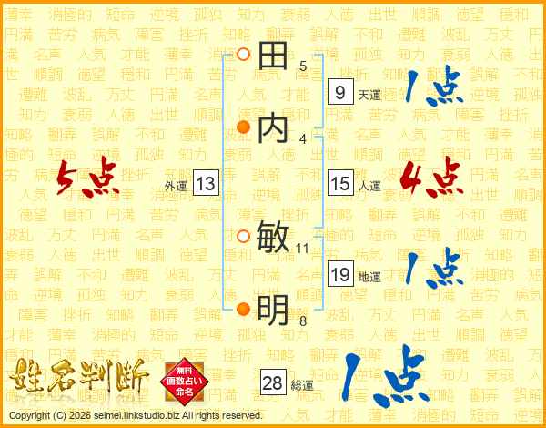 田(5画)内(4画) 敏(11画)明(8画)