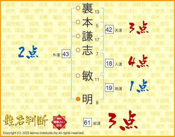 裏(13画)本(5画)謙(17画)志(7画) 敏(11画)明(8画)