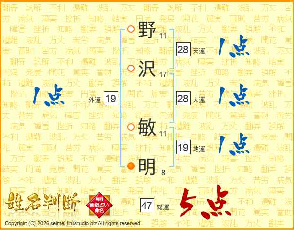 野沢敏明さんの総運は47画の5点!