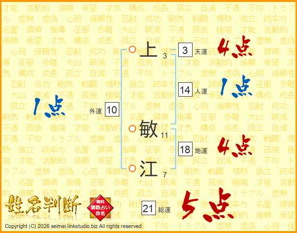 生活面を象徴する運勢です。外部から受ける影響力を表し、結婚運、家庭運や職場、環境への順応性を表します。総運から人運を引いた画数。姓や名が1文字の場合を除く。