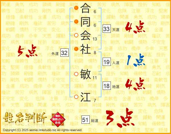 生活面を象徴する運勢です。外部から受ける影響力を表し、結婚運、家庭運や職場、環境への順応性を表します。総運から人運を引いた画数。姓や名が1文字の場合を除く。