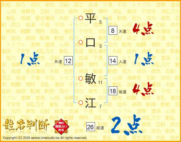 生活面を象徴する運勢です。外部から受ける影響力を表し、結婚運、家庭運や職場、環境への順応性を表します。総運から人運を引いた画数。姓や名が1文字の場合を除く。