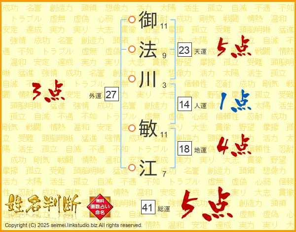 御(11画)法(9画)川(3画) 敏(11画)江(7画)