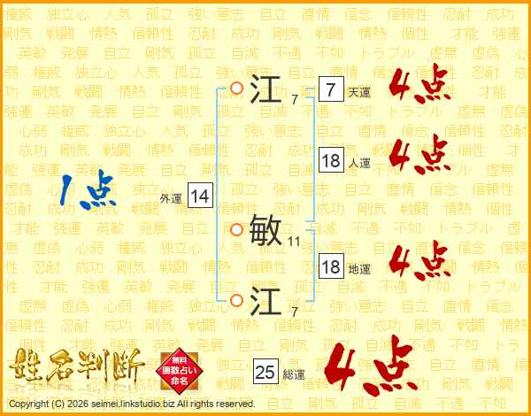 生活面を象徴する運勢です。外部から受ける影響力を表し、結婚運、家庭運や職場、環境への順応性を表します。総運から人運を引いた画数。姓や名が1文字の場合を除く。
