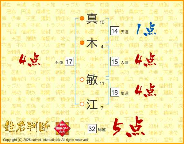 生活面を象徴する運勢です。外部から受ける影響力を表し、結婚運、家庭運や職場、環境への順応性を表します。総運から人運を引いた画数。姓や名が1文字の場合を除く。
