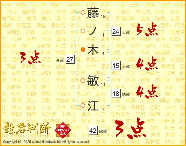藤(19画)ノ(1画)木(4画) 敏(11画)江(7画)