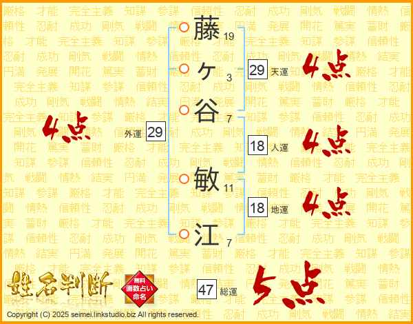 藤(19画)ヶ(3画)谷(7画) 敏(11画)江(7画)