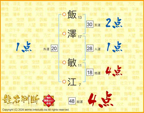 飯(13画)澤(17画) 敏(11画)江(7画)