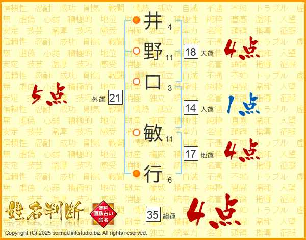 井(4画)野(11画)口(3画) 敏(11画)行(6画)