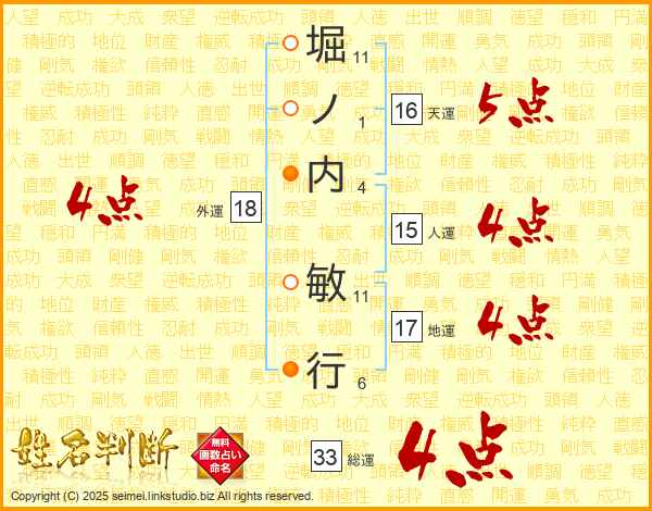 堀(11画)ノ(1画)内(4画) 敏(11画)行(6画)