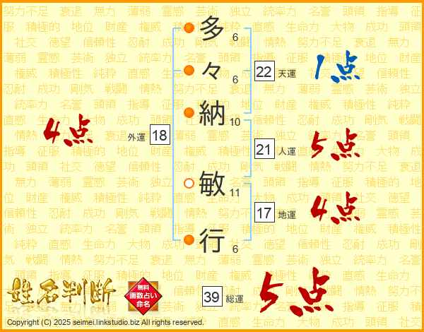 多々納敏行さんの総運は39画の5点!