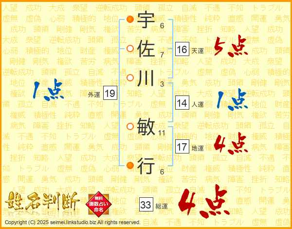 宇(6画)佐(7画)川(3画) 敏(11画)行(6画)