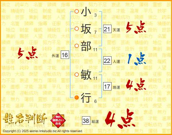 小坂部敏行さんの総運は38画の4点!