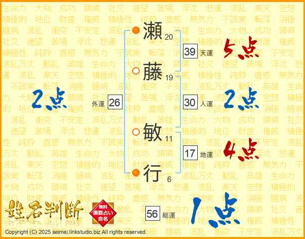 瀬(20画)藤(19画) 敏(11画)行(6画)
