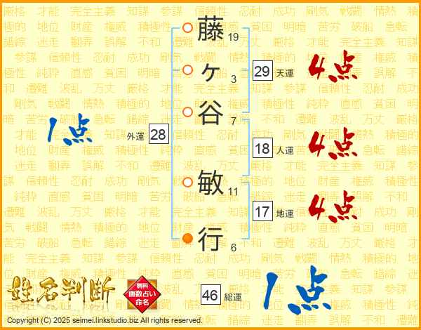 藤(19画)ヶ(3画)谷(7画) 敏(11画)行(6画)