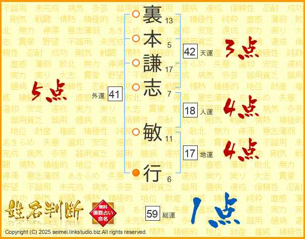 裏(13画)本(5画)謙(17画)志(7画) 敏(11画)行(6画)