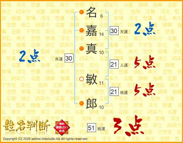 名(6画)嘉(14画)真(10画) 敏(11画)郎(10画)
